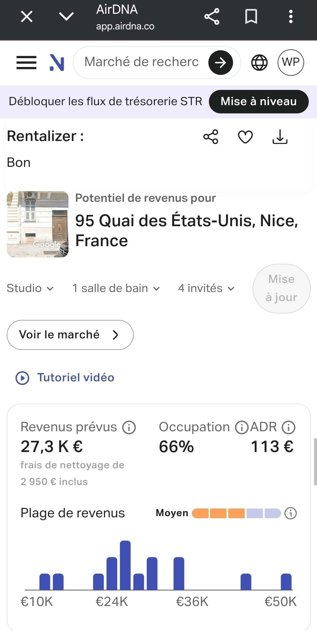 Il suffit de saisir l’adresse 95 Quai des États-Unis, 06300 Nice sur AirDNA, l’outil annonce un revenu moyen de 27 300€ pour un studio dans cette rue.